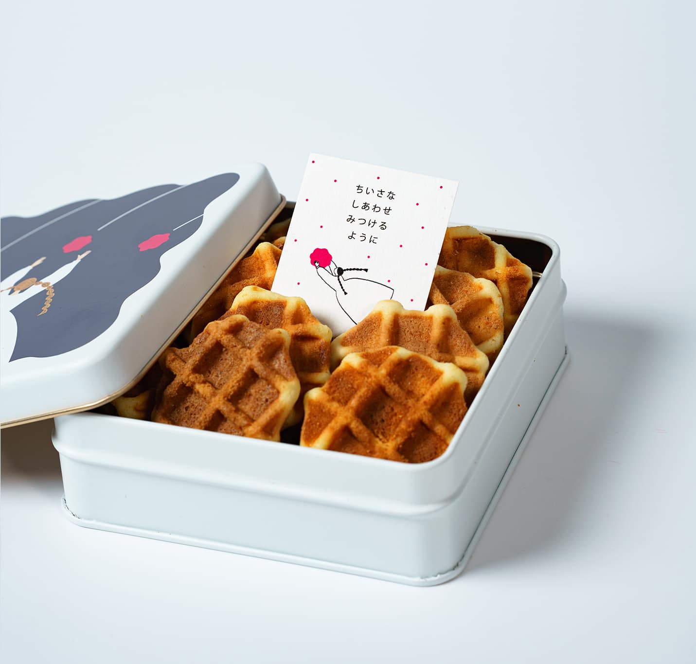 イラストレーターhibiyuu(ヒビユウ)と日の出屋製菓の コラボワッフル缶。VOL.1 お山のふもとでのびのび育てた濃厚なたまごと無塩バターをたっぷり 使って、ひとつひとつを丁寧に手焼きで焼き上げています。 一口サイズのふわサクなワッフルクッキーです。 ギフトやちょっとした手土産にもオススメです。 ワッフル型になった星をつかまえる女の子のイラストがとってもCUTE。 食べ終わった缶はリユース必至!長くお使い頂けると思います!