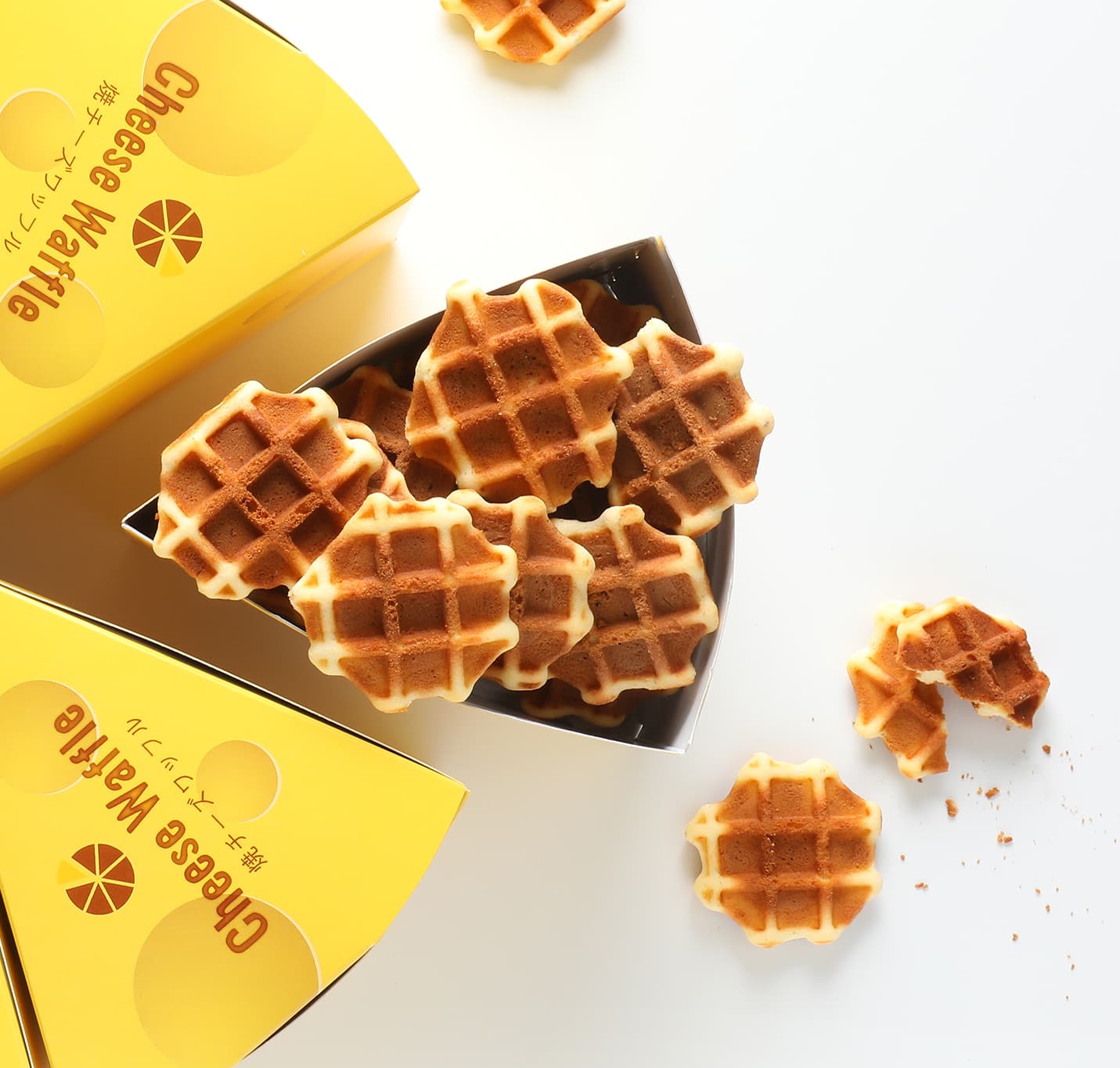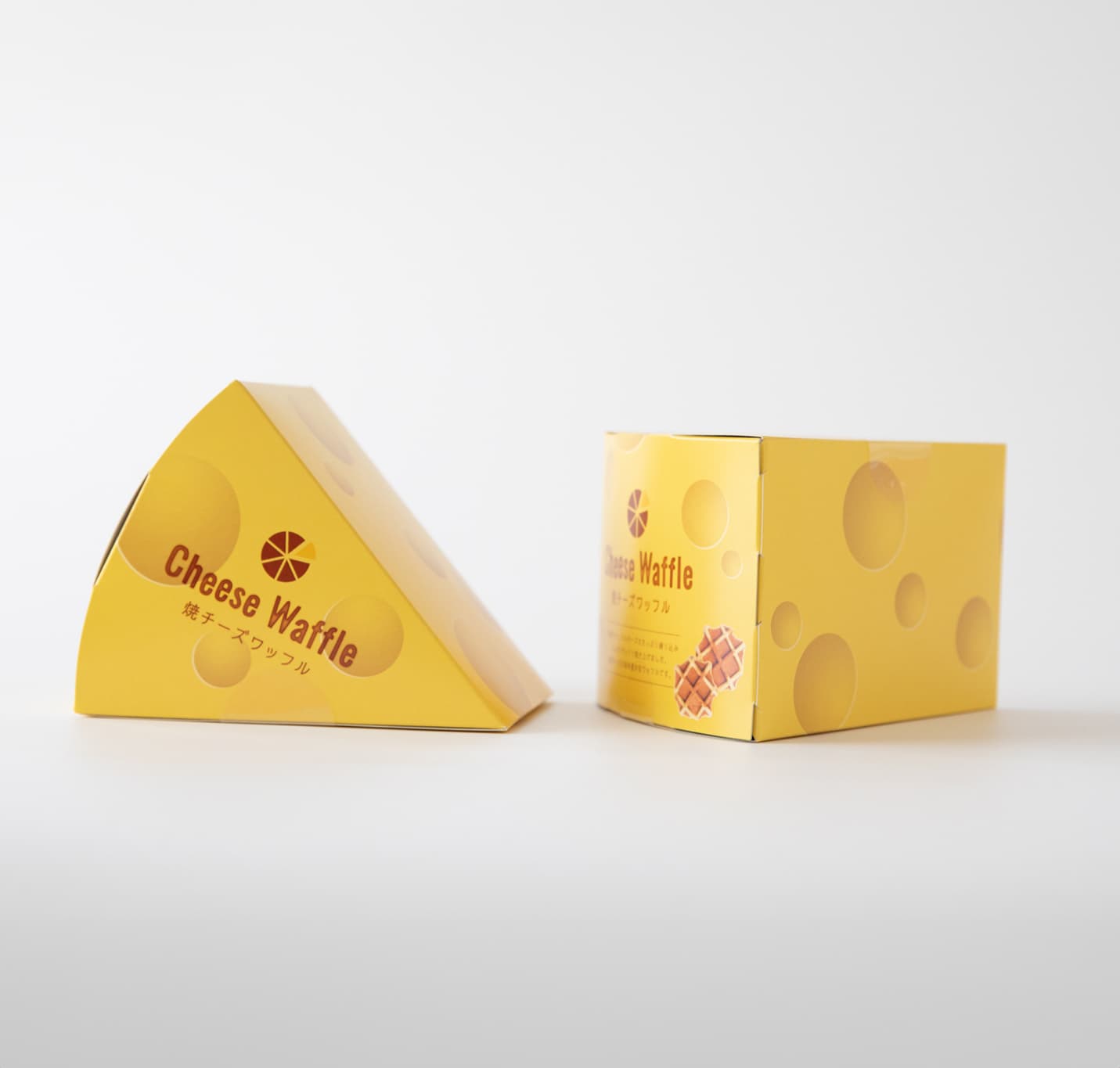 十勝産ナチュラルチーズを使用したサクサク 「焼チーズワッフル」 十勝産のナチュラルチーズと、菰野町産のきららの卵をふんだんに使用したこんがりと香ばしい焼チーズワッフル。パッケージもチーズの形で、7個集めると丸いチーズの出来上がり。お土産にどうぞ。