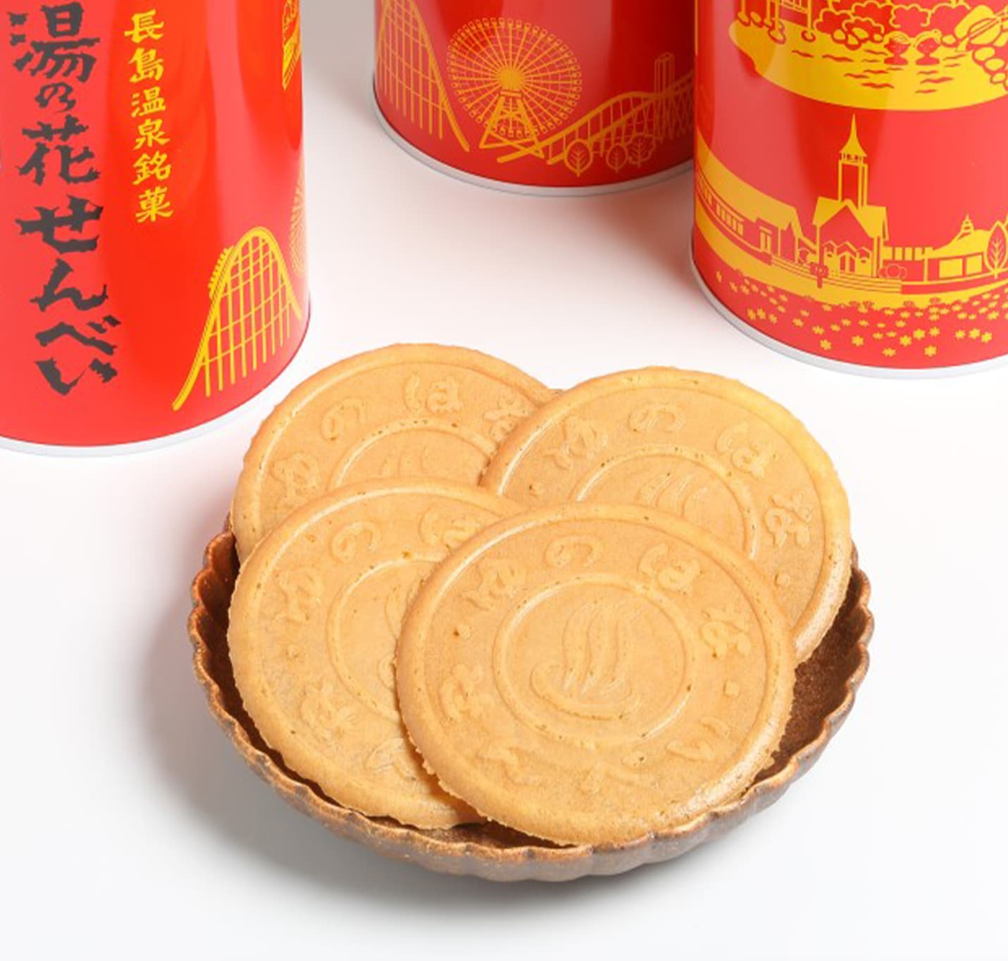 長島温泉でしか買えない限定缶 第19回全国菓子博覧会技術優秀賞受賞の湯の花せんべい限定缶! オンラインショップではピンクの缶のみの販売ですので、長島温泉へお出かけの際はぜひお試しください。